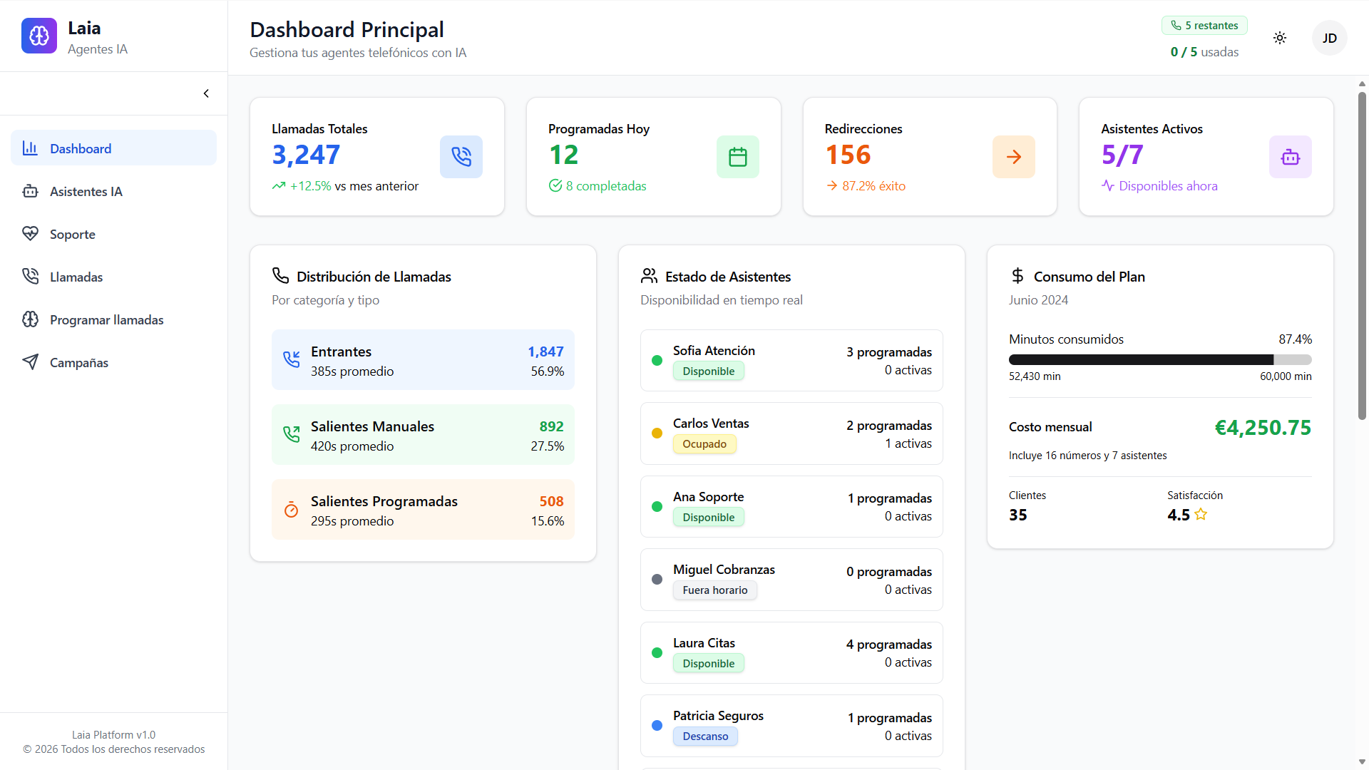 Scaling customer support and outbound campaigns traditionally requires linear increases in headcount, leading to soaring operational costs, inconsistent customer experiences, and limited availability. Laia breaks this bottleneck as a comprehensive AI-powered call center management platform. It provides a 24/7 AI workforce capable of handling routine customer inquiries automatically and following complex conversation flows. This allows businesses to handle increased call volume without proportional staff increases, drastically reducing costs while standardizing a professional customer experience.